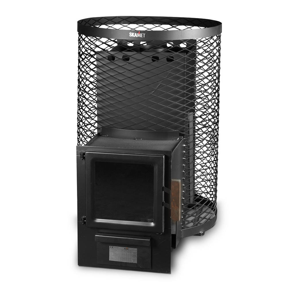 The Skamet SY-216 sauna stove, with a round mesh body that is heated from another room, is perfect for steam rooms ranging from 8-18 m³ in size. In the case of heaters with a mesh body, the sauna session tends to last longer than usual due to the large number of heater stones. The steam room can be heated up within 60-90 minutes. Its compact dimensions make it ideal for smaller steam rooms as well. The wood-burning heater set includes a metal door with a wooden handle, and you can choose the opening of the door according to your preference. Additionally, you have the option to purchase an open hot water tank for heating steam water, as well as heating stones. The boiler connection can be placed on the right, left, rear, or not included at all. If desired, the metal door can be replaced with a heat-resistant glass door. Also, it is possible to purchase a black or stainless steel trim, which transforms the stove into an elegant interior design element.