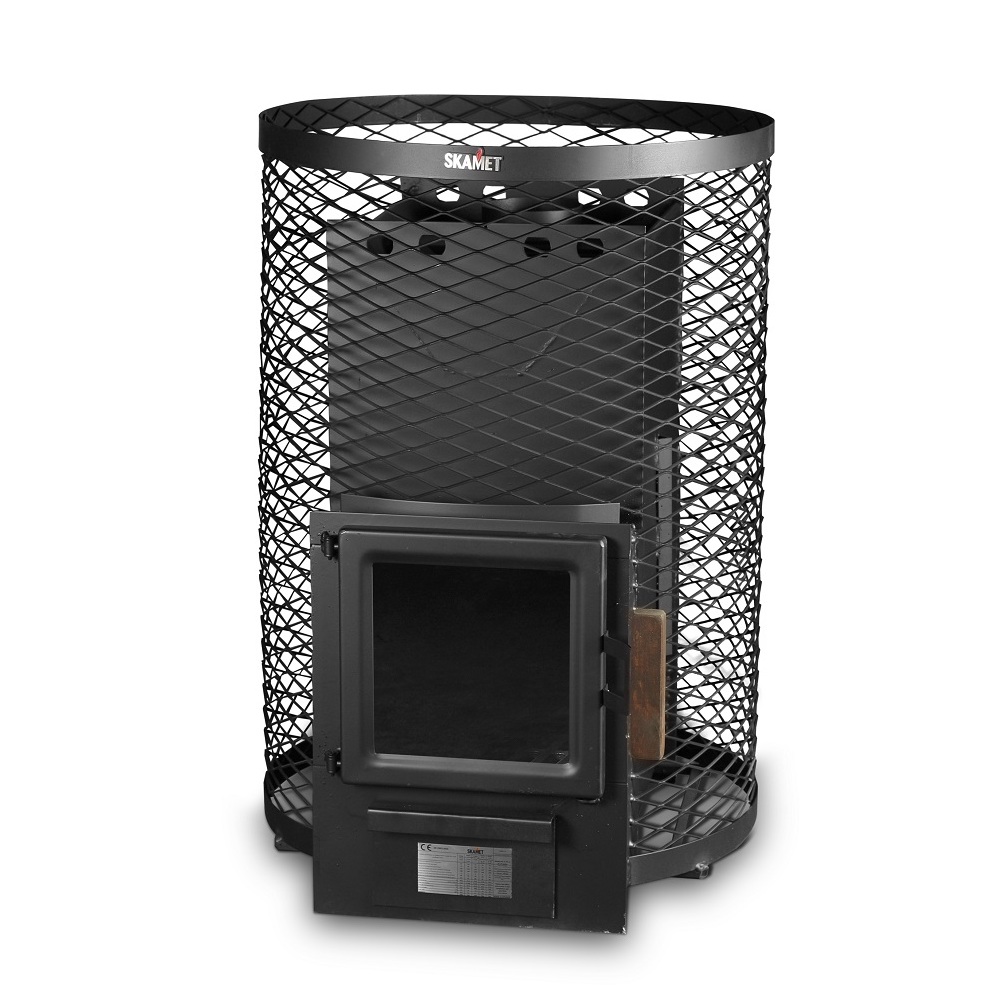 Банная печь Skamet SY-116 с круглым сетчатым корпусом, обогреваемая из того же помещения, идеально подходит для парных объемом 8-18 м³. В случае с каменками с сетчатым корпусом сеанс сауны длится дольше обычного из-за большого количества камней каменки, а парилка прогревается за 60-90 минут. Благодаря своим компактным размерам каменка идеально подходит и для небольших парных. В комплект дровяной печи входит металлическая дверца с деревянной ручкой, есть возможность выбрать сторону открывания двери. Можно купить открытый водонагреватель для подогрева паровой воды, а также нагревания камней. Возможность подключения котла (справа, слева, сзади) или без. При желании металлическую дверь можно заменить на дверь из термостойкого стекла.